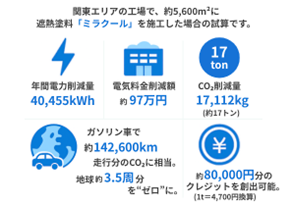 約5,600㎡に遮熱塗料「ミラクール」を施工した場合の試算です。(関東エリア)